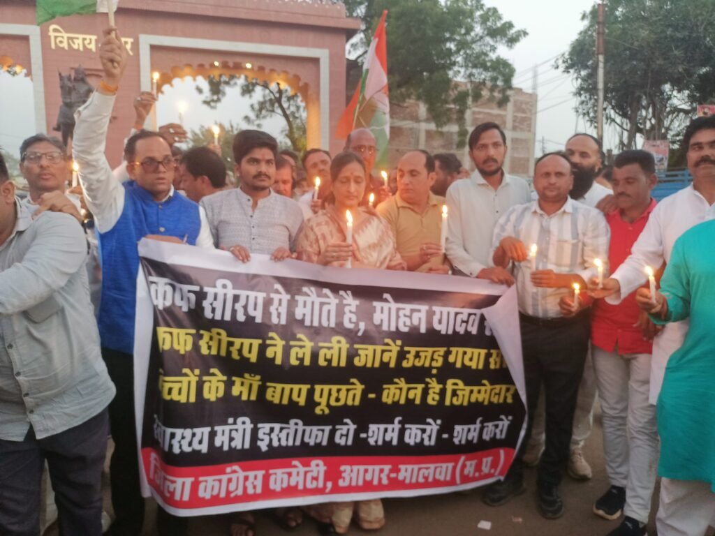अरविंद दुगारिया, आगर मालवा- छिंदवाड़ा में कोल्डरीफ कफ सीरप से 24 बच्चों की मौत से पुरे प्रदेश में सरकारी सिस्टम की आलोचना हो रही है विपक्षी पार्टी जगह-जगह कैंडल मार्च निकालकर उन्हें श्रद्धांजलि दे रहे है. गुरुवार को जिला कांग्रेस कमेटी द्वारा भी पुराने तहसील चौराहे से लेकर विजय स्तम्भ चौराहे तक कैंडल मार्च निकाला गया और मृत बच्चों को श्रद्धांजलि दी. इस दौरान कांग्रेस जिलाध्यक्ष विजयलक्ष्मी तंवर ने भाजपा सरकार व स्वास्थ्य मंत्री को आड़े हाथो लिया. तंवर ने कहा की भाजपा की भ्रष्ट सरकार की वजह से 24 माताओ को अपने बच्चे खोने पड़े, यह सामान्य मौत नहीं है यह सीधे सीधे बच्चों की हत्या है, स्वास्थ्य मंत्री इन हत्याओं के जिम्मेदार है ऐसे स्वास्थ्य मंत्री को जूते से मारना चाहिए. हमारी मांग है की सीएम मोहन यादव व स्वास्थ्य मंत्री इस्तीफा दे.